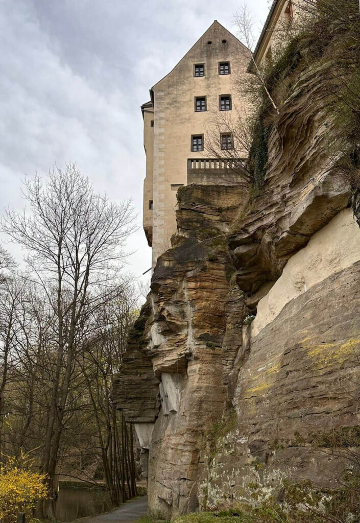 Alsbald sind wir im kleinen Örtchen Lohmen angekommen. Hier ist, zumindest von außen, das Schloß sehenswert, da es hoch oben in sehr gewagter Bauweise auf einem schroffen Felsen thront. Wann es genau erbaut wurde ist nicht bekannt; die erste bekanntliche Erwähnung führt jedoch ins Jahr 1523 zurück, als die Brüder Wolf und Ernst von Schönburg den Lehsitz Lohmen erwarben. Besichtigt werden kann es durch den Besuch der Bibliothek und der Tourismusinformation, die sich im Schloß befinden. Unterhalb des Schloßes befindet sich jedoch ein netter Picknickplatz direkt an der Wesenitz, den wir natürlich sehr gern nutzen.